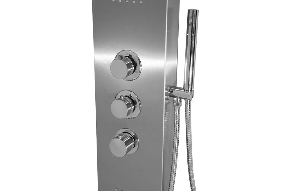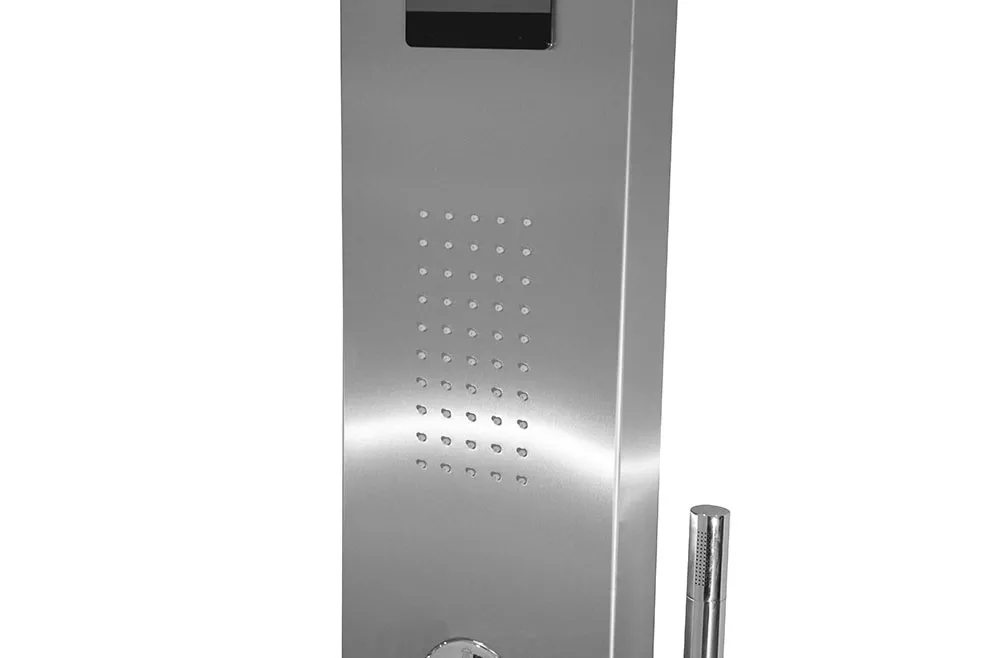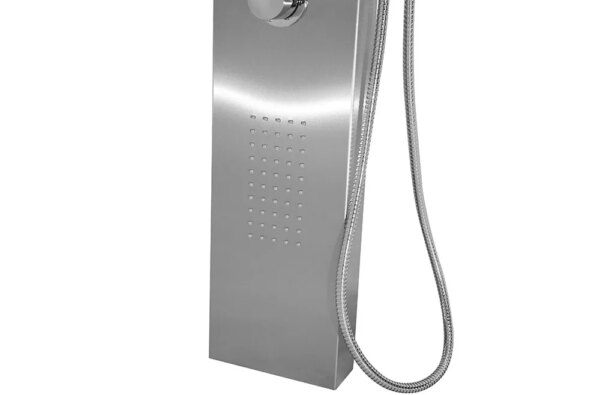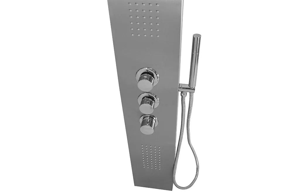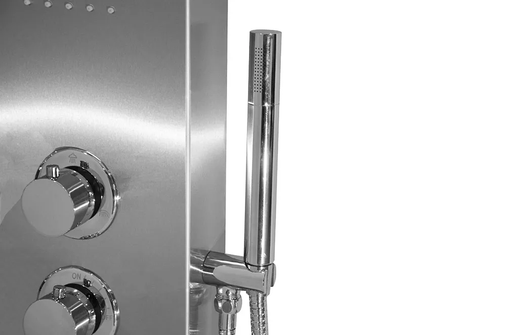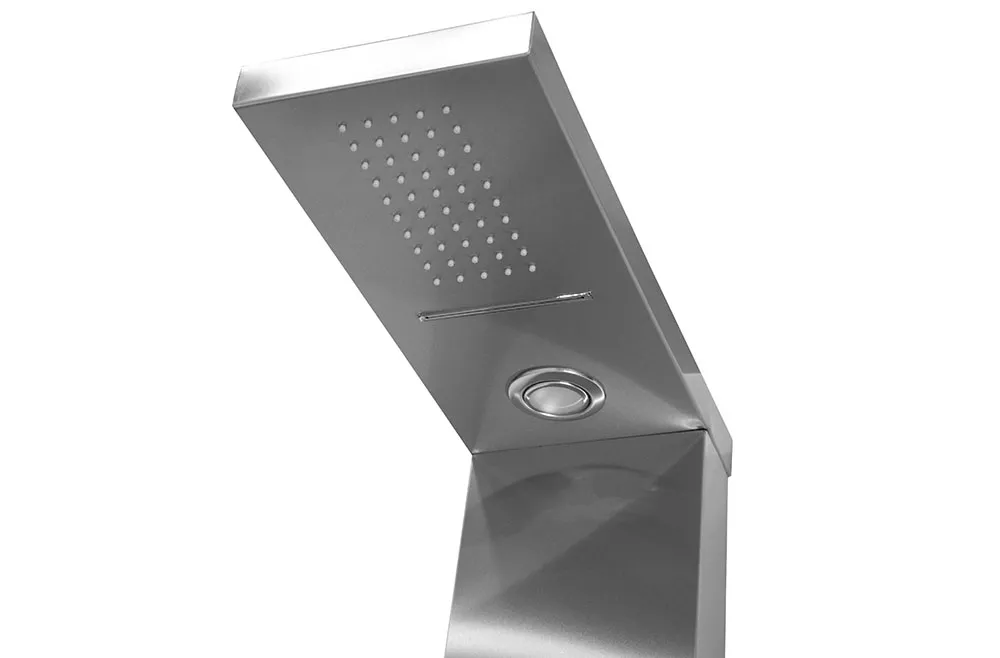 – Shower mixer (thermostatic): yes (mixing valve, distributor, water flow regulator) – Chrome-plated knobs: yes – Hand shower: 1 pc. – Rain shower: 1 pc. – Spout: 1 pc. (mounted in the upper part of the panel) – SPA light: 1 pc. (1 colour – white) – Control panel: yes – Radio: 1 pc. – Speaker: 1 pcs. Panel type: shower with hydromassage