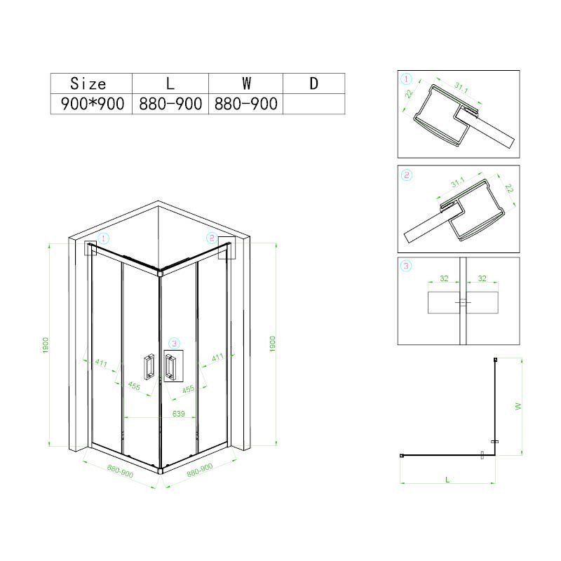 size: 900x900x1900mm