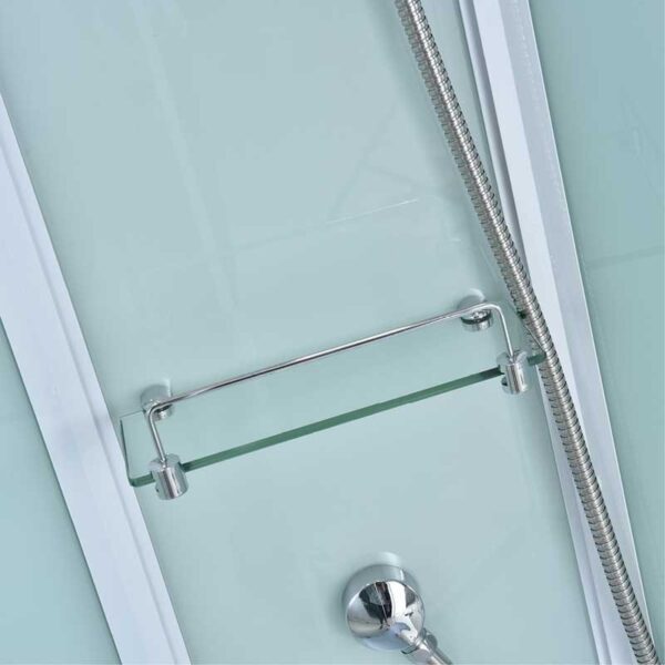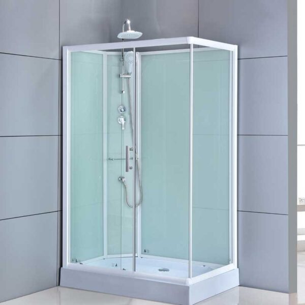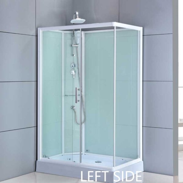 THE BACK WALLS ARE MADE OF TEMPERED MILKY GLASS (YOU CAN’T SEE WHAT IS BEHIND THE WALLS)