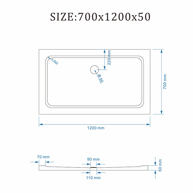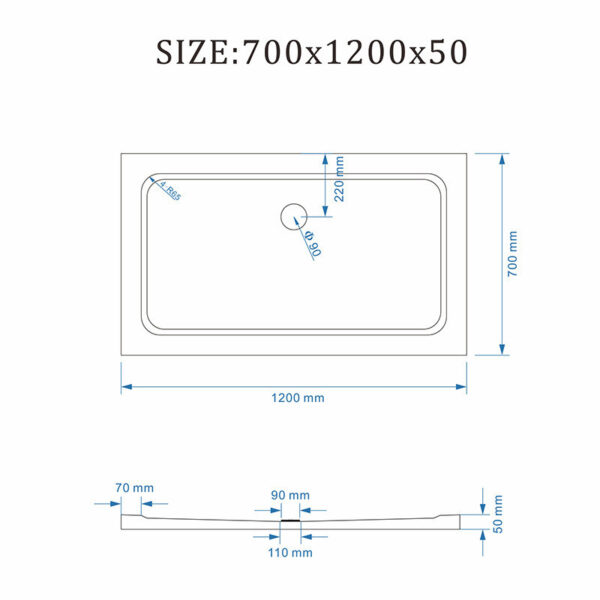 Rectangular shower tray 1200x700mm ST05E white siphon 5cm slim