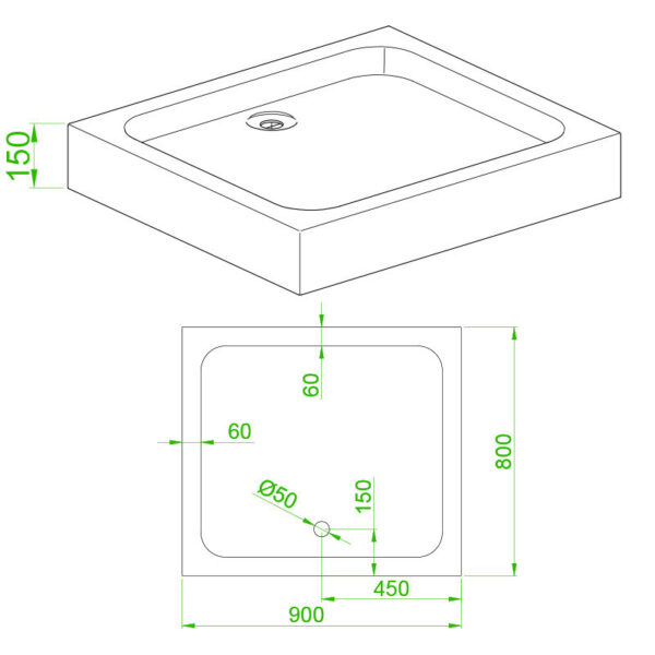 Rectangular shower tray 900x800mm SXL03B white white siphon 150mm high