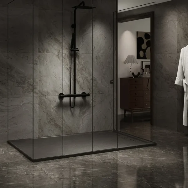 The natural texture of the shower tray introduces a unique, elegant character to the interior. It combines aesthetic appeal with a modern look that enhances the entire room.