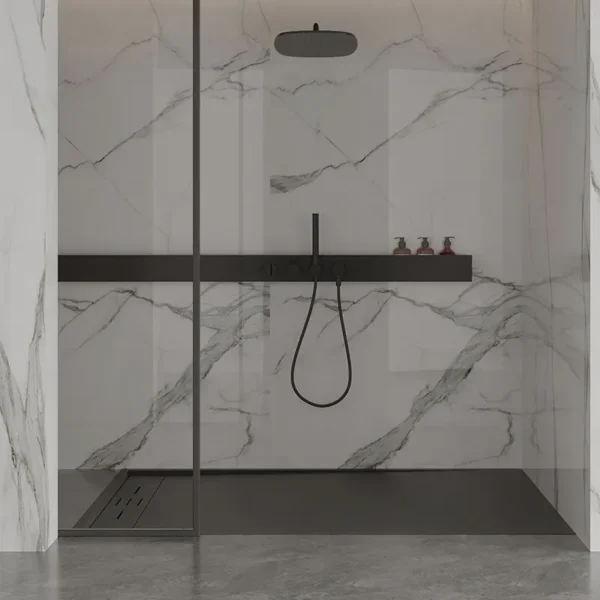 Choose traditional floor installation to emphasize the shower tray as a separate decorative element, where its stone-like finish becomes a visual centerpiece. Alternatively, opt for flush-mounted floor installation for a clean, minimalist aesthetic. The slim 30 mm profile ensures seamless integration in both cases.