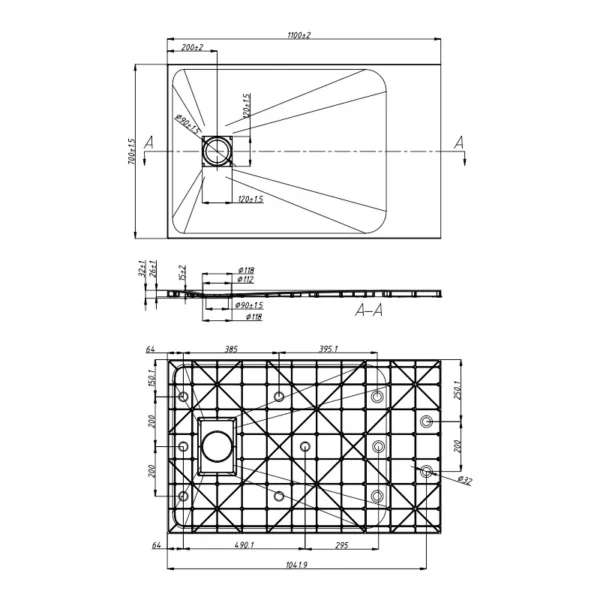 AIR Rectangular Shower Tray 1100×700×26 mm Black with Siphon