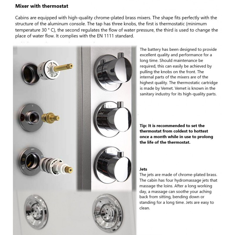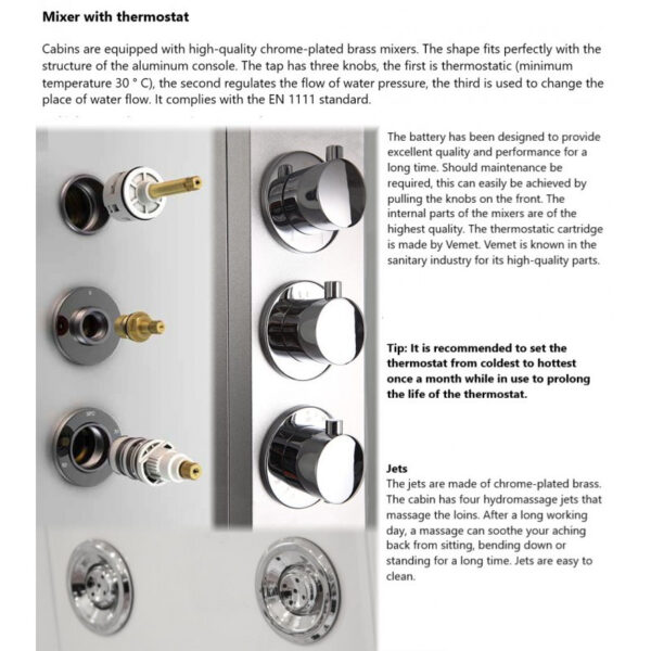 Shower faucet (thermostatic): yes (mixing valve, manifold, water stream regulator)
