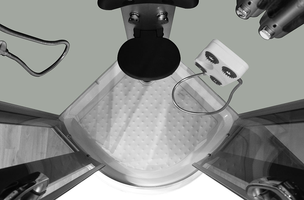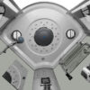 The interior features a folding seat with backrest, two soap dispensers, a cosmetic shelf, and a mirror, making everyday use both practical and comfortable. The cabin is illuminated with LED lights (12 pieces on the walls and 24 pieces on the ceiling), creating a modern atmosphere and a pleasant ambience.
