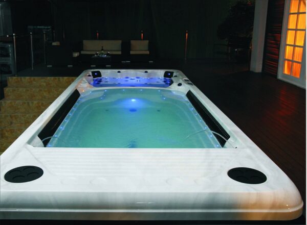 The pools are adapted for use both inside and outside, in summer and winter. Thanks to the thermal coating and full insulation of the bottom of the basin and the casing, the water’s heat is kept at the same level for a longer time. Also, electricity costs are minimized. Illuminated handrails or water poles add color to the entire device.