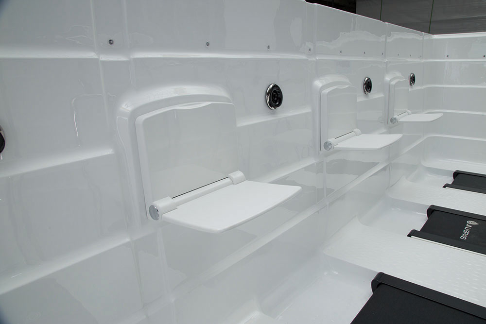 The pools are adapted for use both inside and outside, in summer and winter. Thanks to the thermal coating and full insulation of the bottom of the basin and the casing, the water’s heat is kept at the same level for a longer period of time, and, also, electricity costs are minimized. Illuminated handrails or water poles add color to the entire device.