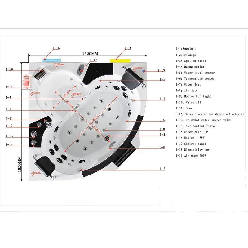 * 22 small streaming jets(back, legs, sides of the bath)