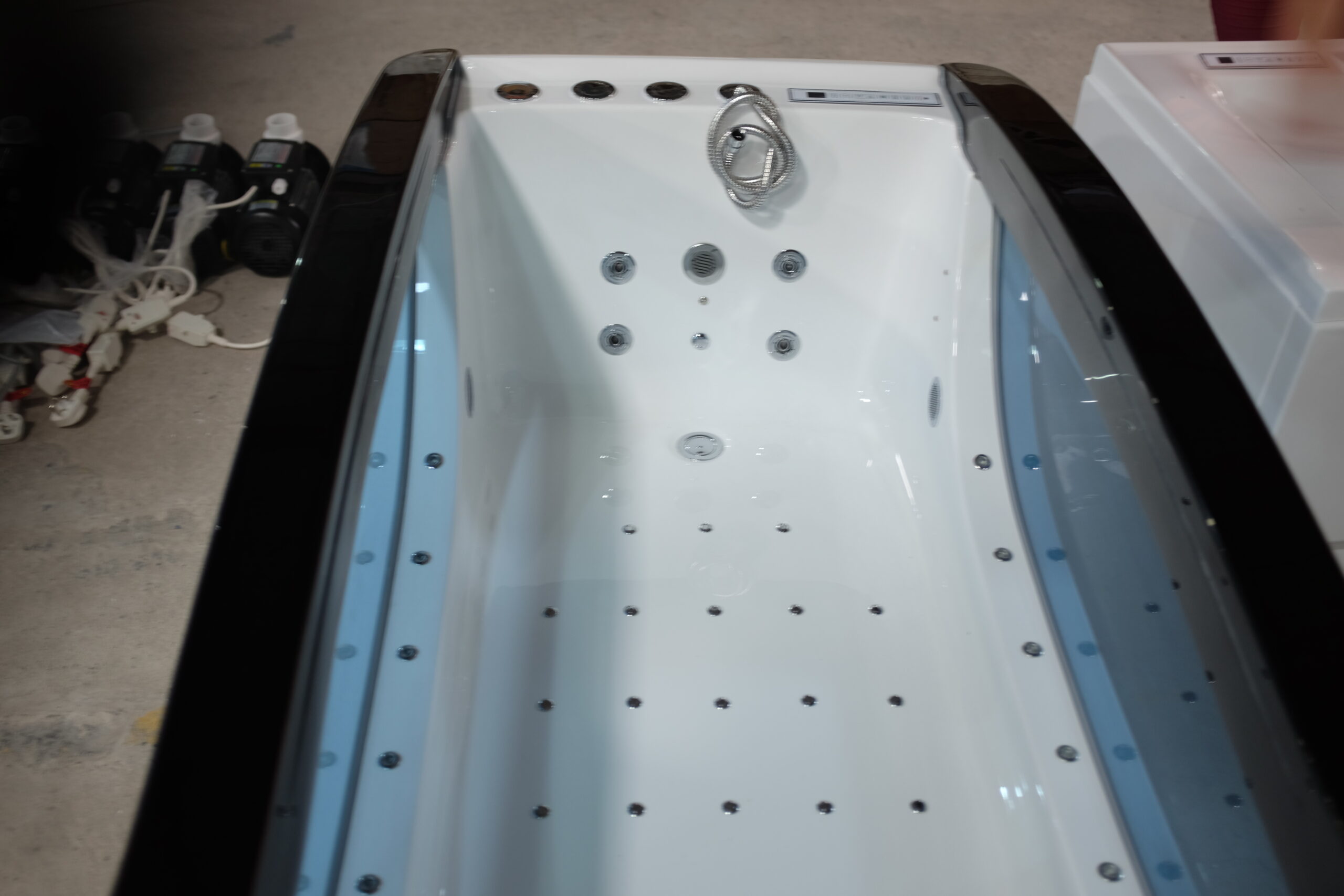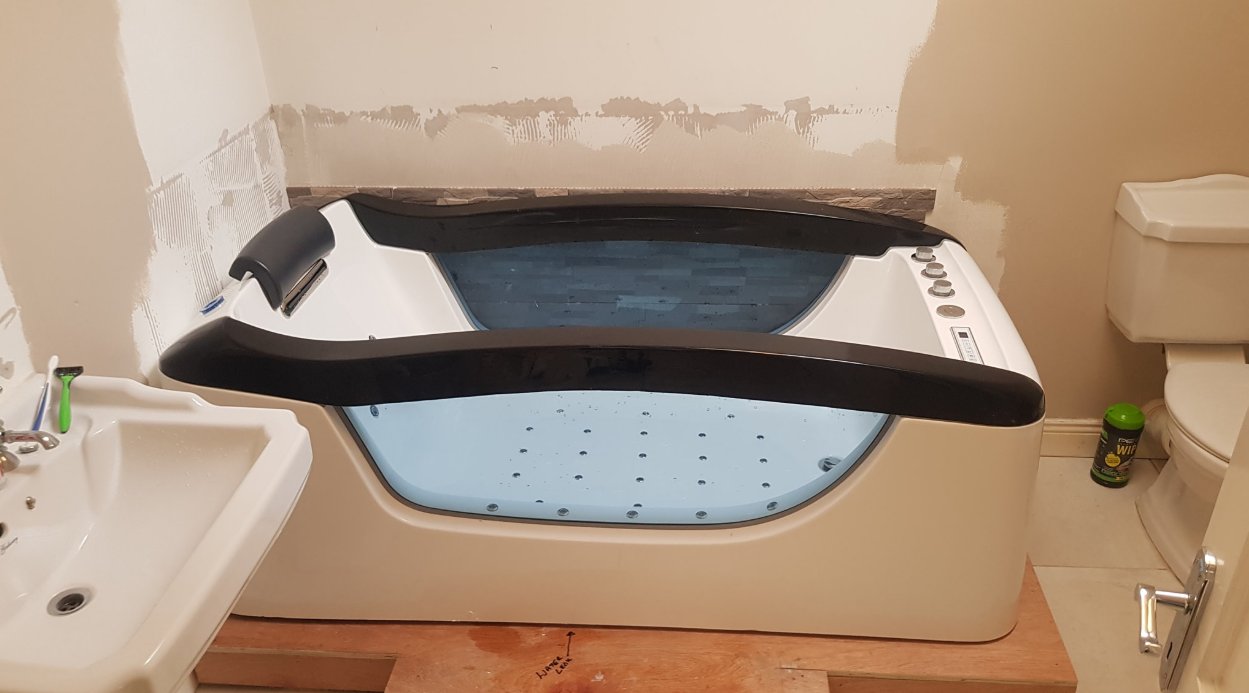 The bathtub is on a steel frame !!! parallel airbus (each jet is powered separately) serial water line (jets connected in a closed circuit)
