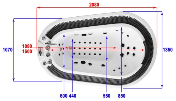 Control panel, remote control – the panel supports all bathtub functions starting from starting the pumps, ozone generator, lighting, radio, and the heater end.