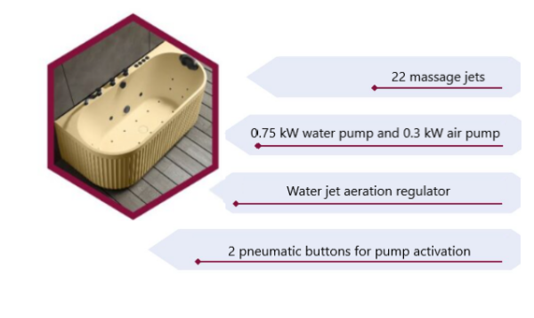 The combination of a 0.75 kW water pump and a 0.3 kW air pump ensures powerful water massage and gentle bubble massage. This reliable system provides optimal water pressure and deep relaxation, significantly enhancing the bathing experience.