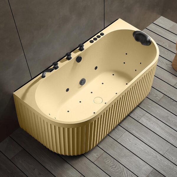The bathtub is a freestanding wall-mounted model, enclosed on three sides, offering an ideal balance between elegance and practicality. The freestanding appearance, combined with wall installation, saves space and neatly conceals plumbing connections. The ribbed enclosure enhances aesthetics while ensuring easy cleaning and everyday comfort.
